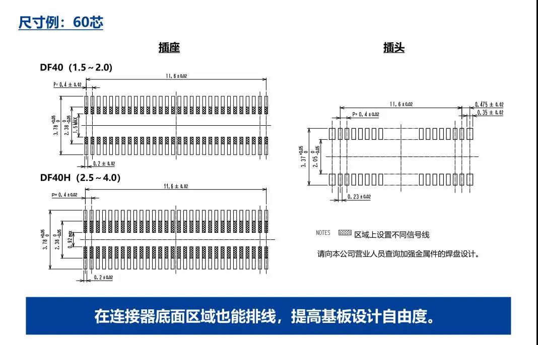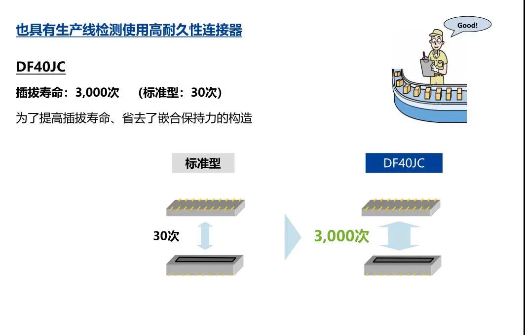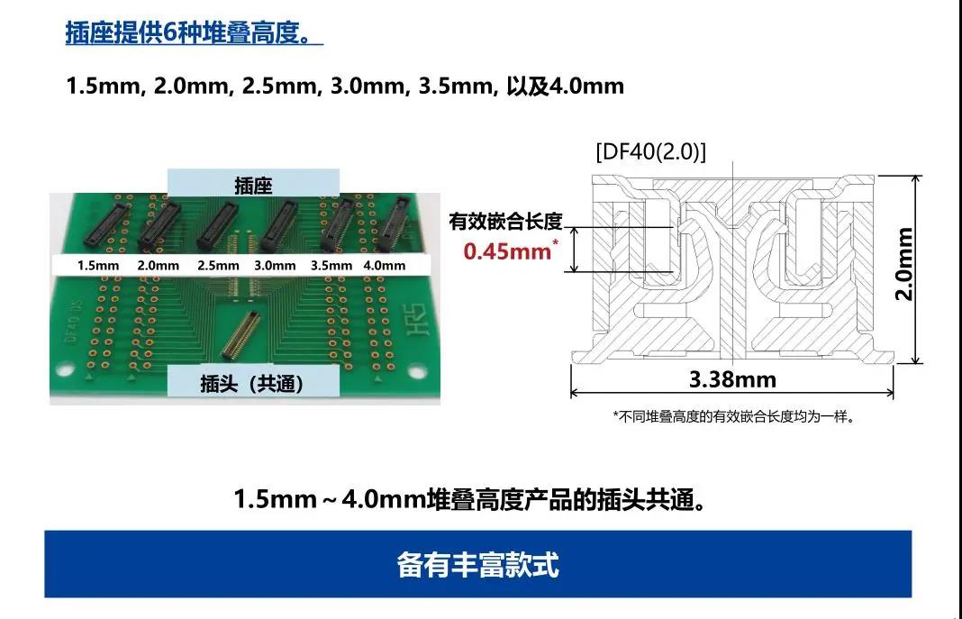特點 1. 省空間:縱深3.38mm 2. 堆疊高度 1.5-4.0mm 3. 對應USB4 Gen.2(10Gbps)信號傳輸 *1 4. 有效嵌合長度長:0.45mm 5. 卓越的端子構造實現了明確的鎖扣手感以及大嵌合力 6. 防止端子變形構造 7. 種類繁多(帶護罩:DF40G系列,帶完全鎖:DF40GL系列,ADAS:DF40T系列) 8.核心數量從10到120核心變化巨大 9.用導向肋確保自動對準:0.33mm 10.防止鎳阻擋層焊接的結構 11.還提供用于生產線檢查的高度耐用的連接器* 只有H=1.5 mm的產品支持Type-C DF40系列變體