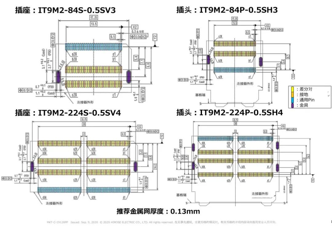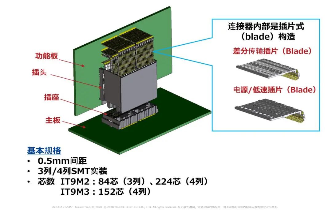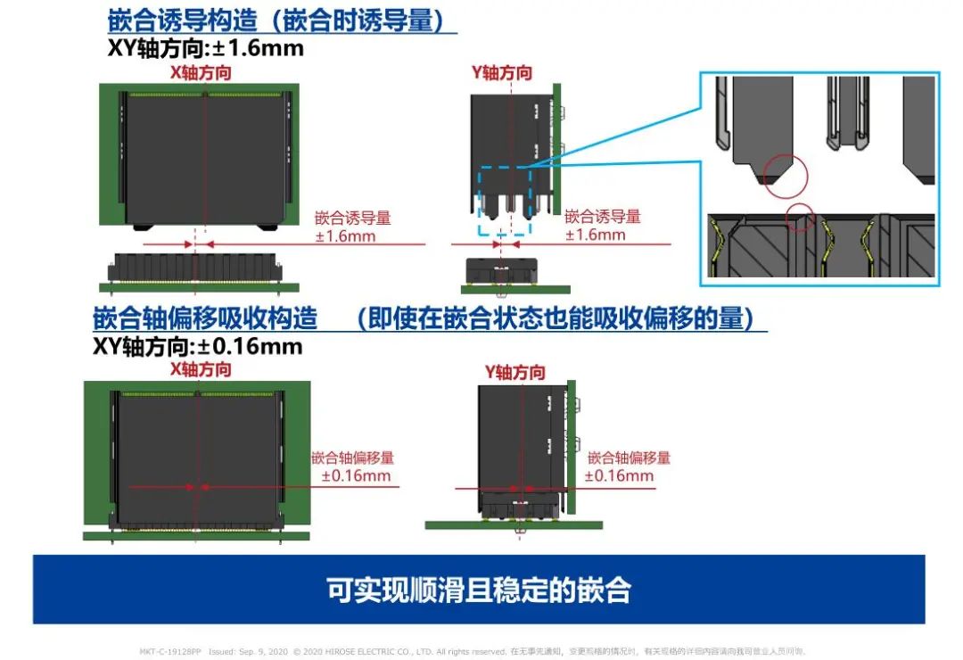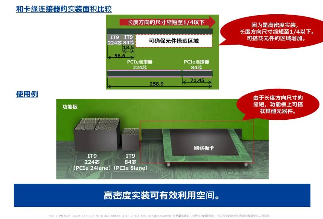 1 支持高速傳輸(28 + Gbps) 2 高密度: 50差分對/inch(224芯) 3 浮動構造: 可以在同一基板上實裝多個連接器 4 選型 芯數:84芯、152芯、224芯 對應PCI Express 4.0/5.0